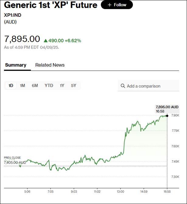 Because traders are sheep, the ASX looks set to open strongly – maybe up 6%. This is more about perception than reality. Nothing has changed for Australian companies and given the increased tariffs on China, you could argue things are worse. But because the US market soared, everyone will assume the Australian markets will – at least initially – soar, and so that will happen.